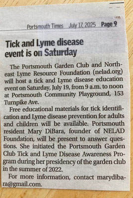 With funding from a RI State Senate Legislative Community Service grant, Portsmouth Garden Club launched a tick bite prevention and Lyme disease awareness program this past summer at Sandy Point Town Beach. This program is a partnership with the Town of Portsmouth and the RI Dept. of Health.